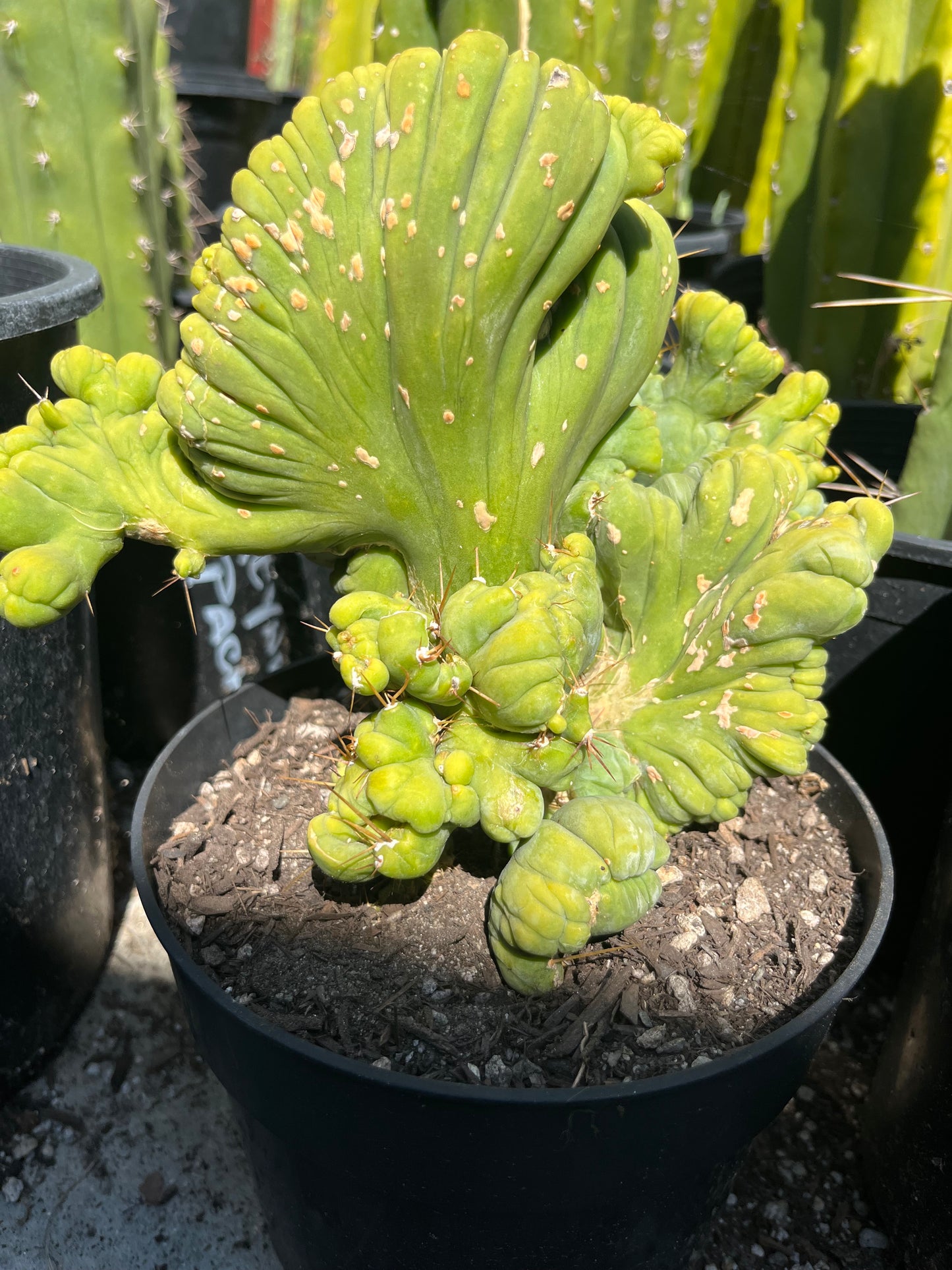 8 1/2” wide Trichocereus Bridgesii Monstrose Crest cutting with roots showing. Unique combination of crested and phallic growths, some resembling TBM clone A others clone B. Sent bare root without 6” pot. Made in the USA.